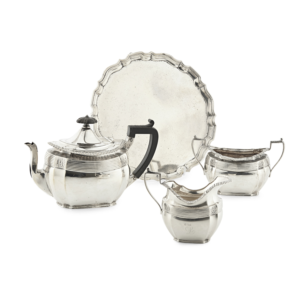 Sheffield 1918, comprising teapot, twin handed sugar bowl and milk jug, with reeded girdle and gadrooned rim; together with a salver, London 1906, with pie crust edge raised on three hoof feet, (4)