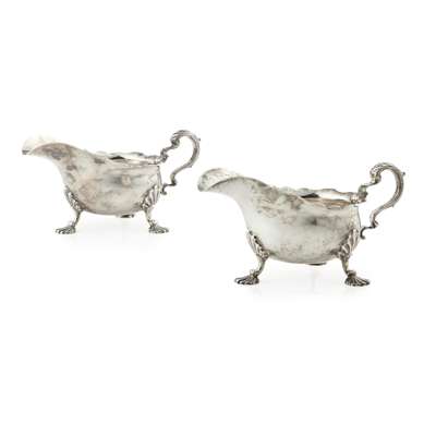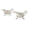 retailed by Munsey & Co, Cambridge, Sheffield 1916, the baluster bodies with everted scalloped rim and wide pouring spot, engraved crest to the body, with leaf capped S scroll handle, on leaf and shell feet (2)