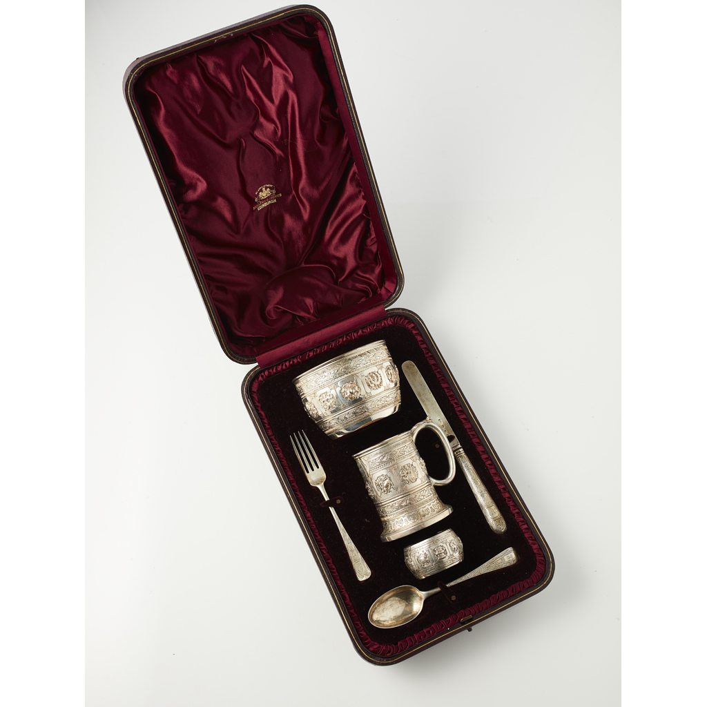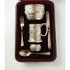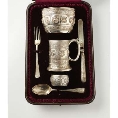 Hamilton & Inches, Edinburgh 1911, comprising mug, bowl, napkin ring, fork, knife, spoon, all with heavily embossed astrological design, CEC engraved to cartouche, in a fitted box retailed by Hamilton & Inches; together with a pap spoon