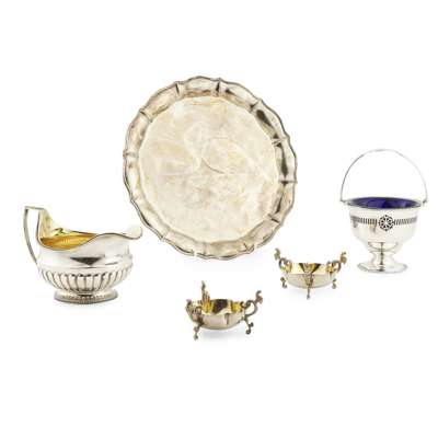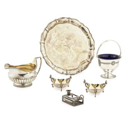 to include; a card tray, Birmingham circa 1910, serpentine outline, plain; a pair of Victorian salts of lobed form, cast handles, gilt interior; a Georgian style sugar basket and liner; a George III cream jug, marks worn, with two white metal small lidded sugar bowls and covers (qty)