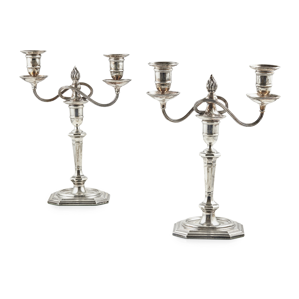 James Dixon & Sons Ltd, Sheffield 1908, of octagonal form, tapered stems, domed stepped base, the removable candelabra with central flame finial and scrolling twin branches (loaded)