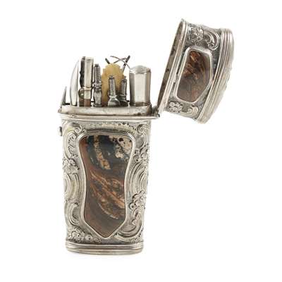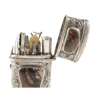 apparently unmarked, the tapering body with hinged cover, chased scroll decoration with four shield-shaped agate panels, the fitted interior with accoutrements