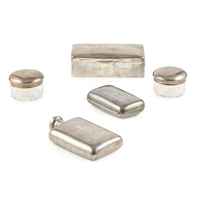 comprising: a Victorian silver cigar box, mark of John Harris, London, 1855; a Victorian silver cigarette box, mark of James Dixon and Sons, Sheffield, 1898; a pair of silver and glass jars, London, 1904; and a silver flask, mark of Cole Brothers, London, 1918 (5)