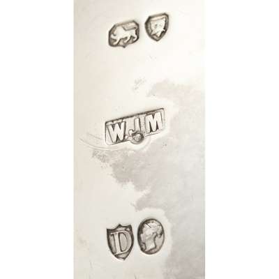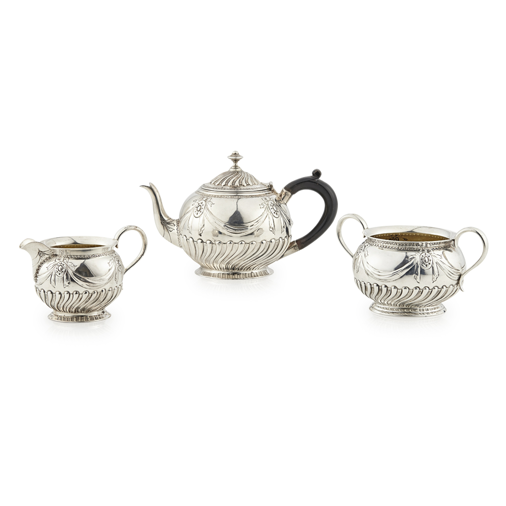 W.J.M., London 1879, comprising, teapot, twin handled sugar bowl and milk jug, of circular form, demi-fluted body, with swag and bow detail, S scroll handles, domed finial to teapot (3)
