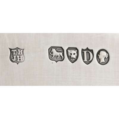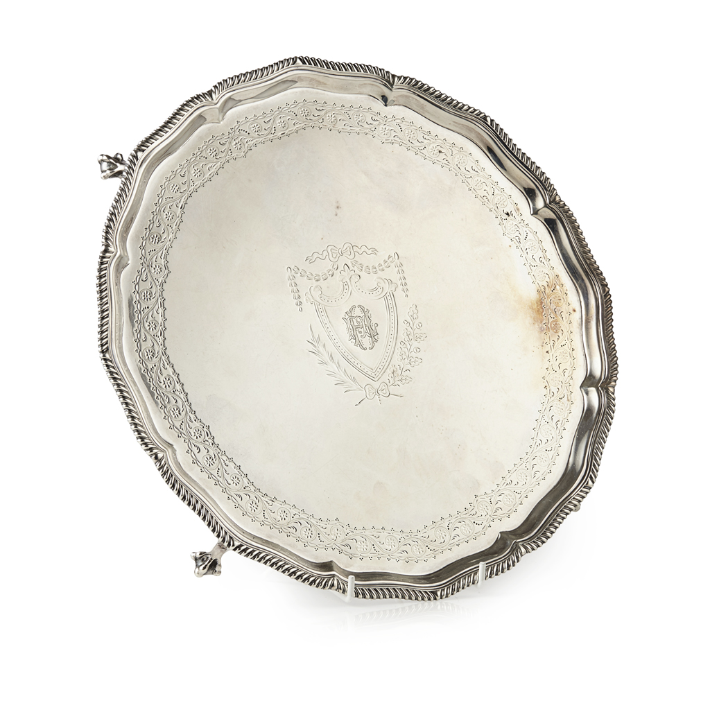 Thomas Bradbury & Sons, London 1879, of shaped circular form, gadroon border, engraved floral border, shield and garland cartouche to centre, raised on four claw and ball feet