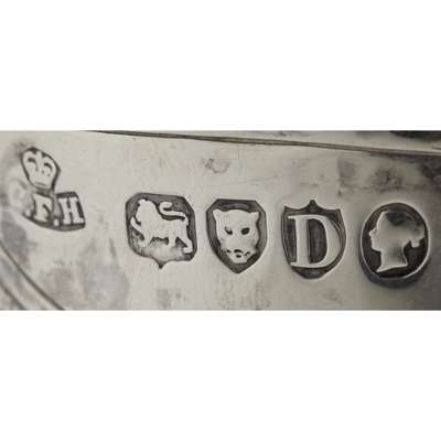 Charles Frederick Hancock, London 1879, of moulded hexagonal form, chased anthemion and mistletoe detail to body, tall knopped stem, raised on a stepped foot with embossed acanthus detail