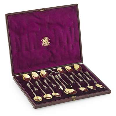 S.C., London 1849, of tapering form, engraved border of foliate design with an engraved crest, raised on a stepped foot, together with a cased set of parcel gilt teaspoons and tongs, seal top terminals, decorated stems, gilt bowls