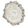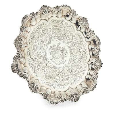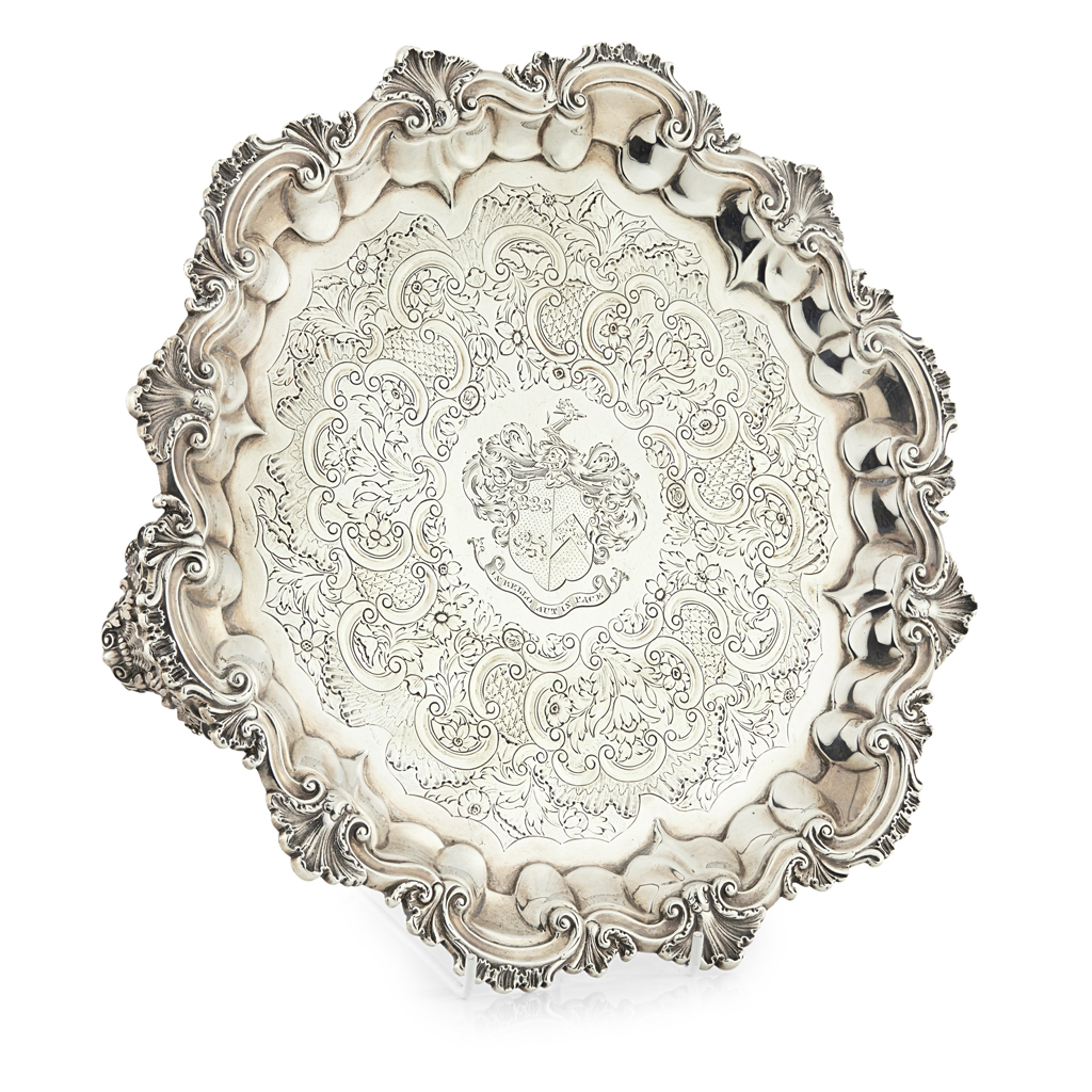 BM, London 1831, of shaped circular outline with cast scroll and shell border, the centre heavily engraved with foliate banding and central armorial, raised on three shell bracket feet