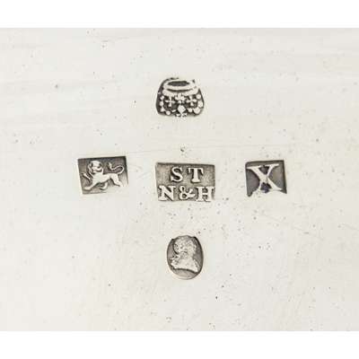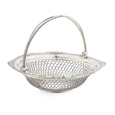 Smith, Tate & Co, Sheffield 1817, of circular outline with cast gadrooned and scroll border and reeded swing handle, the body formed of woven wirework with plain boss to centre