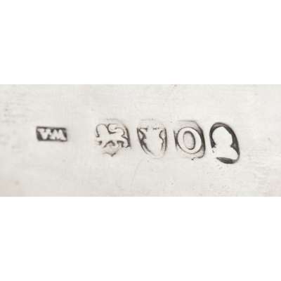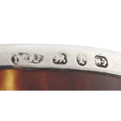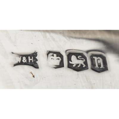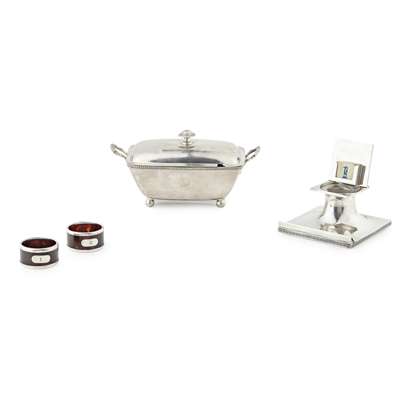 W. A. London 1809, of rectangular form, crimped border, cast decorative handles, die engraved to body, raised on four ball feet, with pull off lid; together with an inkwell, Walker & Hall, Sheffield 1930, Greek Key border, pull out calendar and a cased pair of silver mounted tortoiseshell napkin rings, Birmingham 1893 (3)