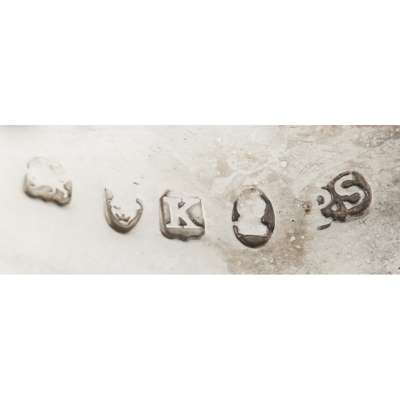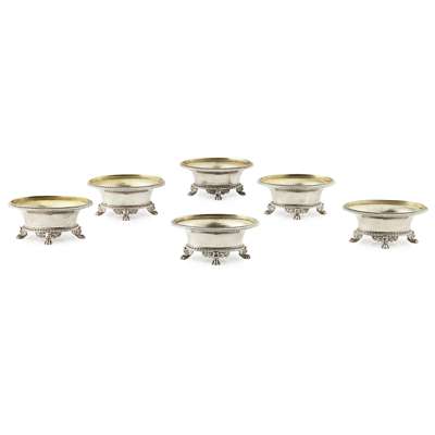 Paul Storr, London 1805, of oval 'bath' form, cast gadroon borders, raised on four bracket feet with shell and paw detail, gilt interior (6)