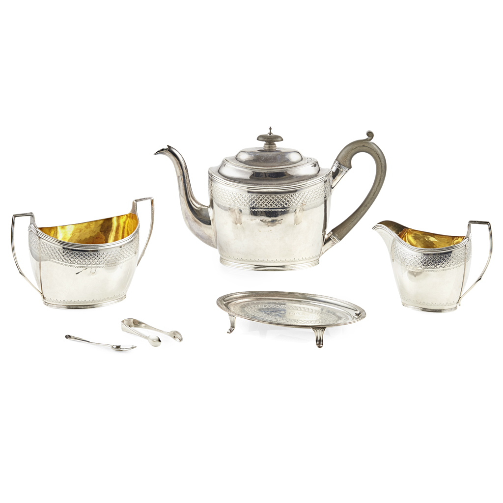 Peter, Ann & William Bateman, London 1803, comprising a teapot, teapot stand, twin handled sugar bowl, milk jug, all of oval form, bright cut engraving boder, angular handles; together with a sugar shovel and plated sugar tongs (6)