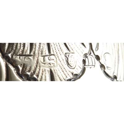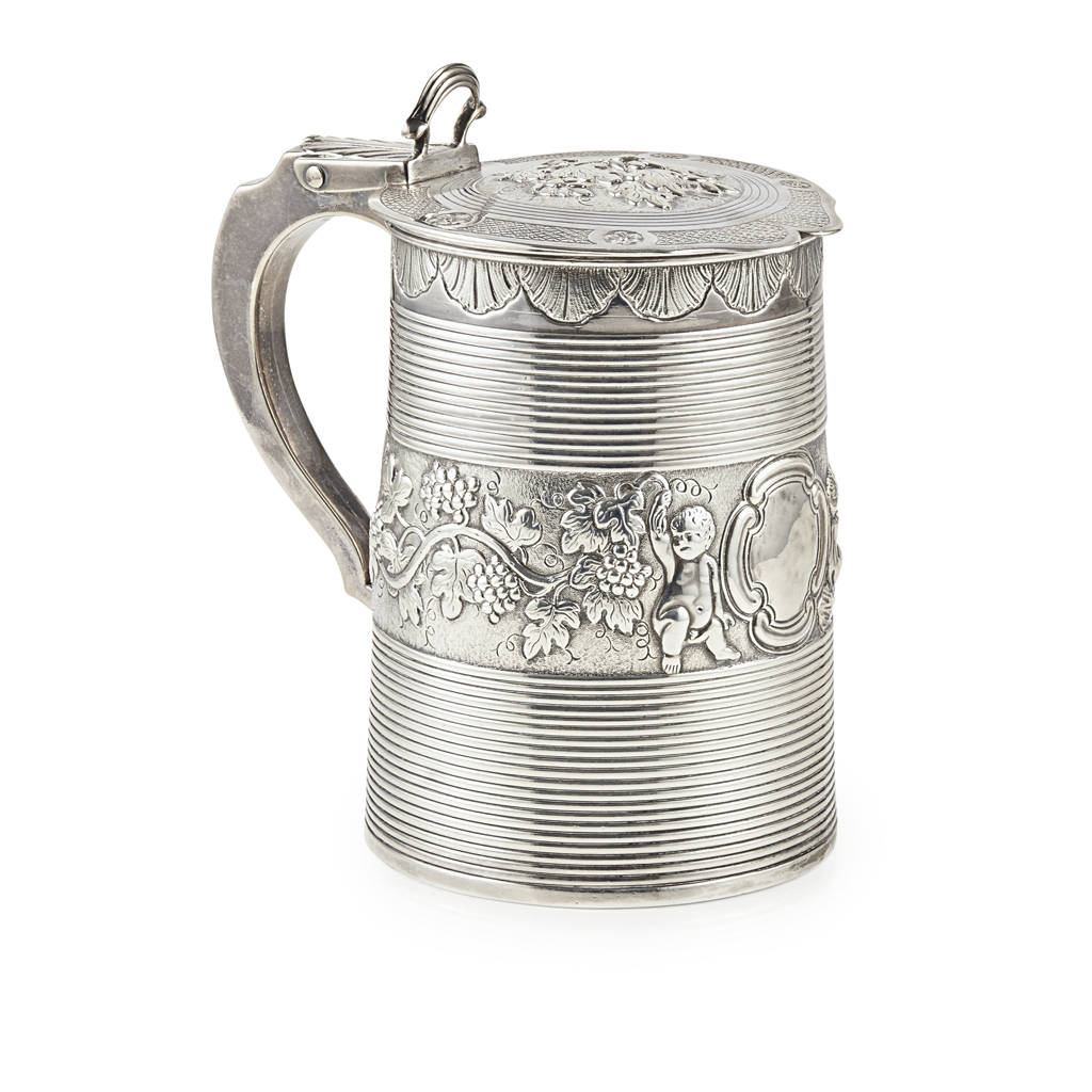 London 1787, of conventional slight tapering form, threaded bands, central later heavily embossed vine and cherubic border, vacant cartouche to centre, the hinged cover with loop thumb piece