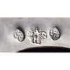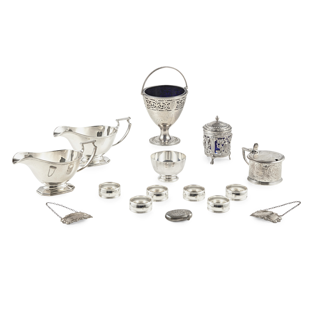 to include; a George III swing handled sugar bowl, WP, London 1781, of neo classical vase form, pierced decoration and bright cut engraving, pedestal foot, blue glass liner; a George III lidded mustard pot, London circa 1800 of drum form, engraved allover decoration; a French mustard pot and cover, fluted hinged cover, pierced panels decorated putto, and figures, blank cartouche, all on paw feet; other modern silver to include, pair sauce boats, sugar bowl, napkin rings, wine labels (qty)