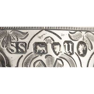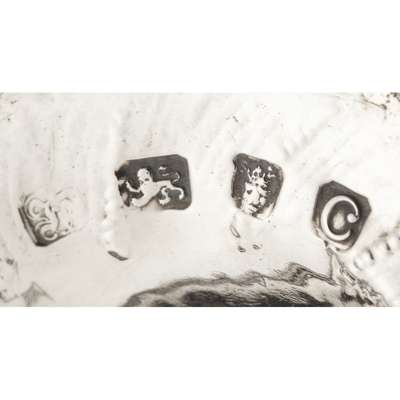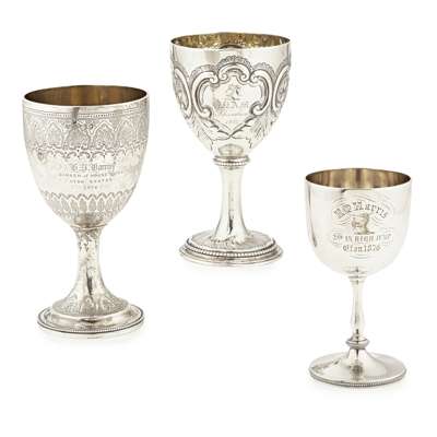 London 1778, of traditional form, later floral embossed embellishments, raised on a spreading beaded foot; together with a stemmed goblet, SS, London 1876, engraved decoration and presentation inscription dated 1876 and another smaller plated stemmed goblet (3)