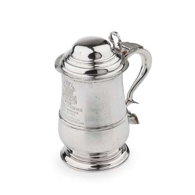 Wakely and Wheeler, London 1895, of George II style, domed lid, scrolling thumb piece, scroll handle, engraved armorials and inscription