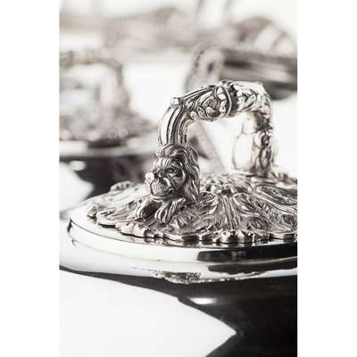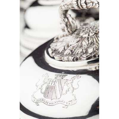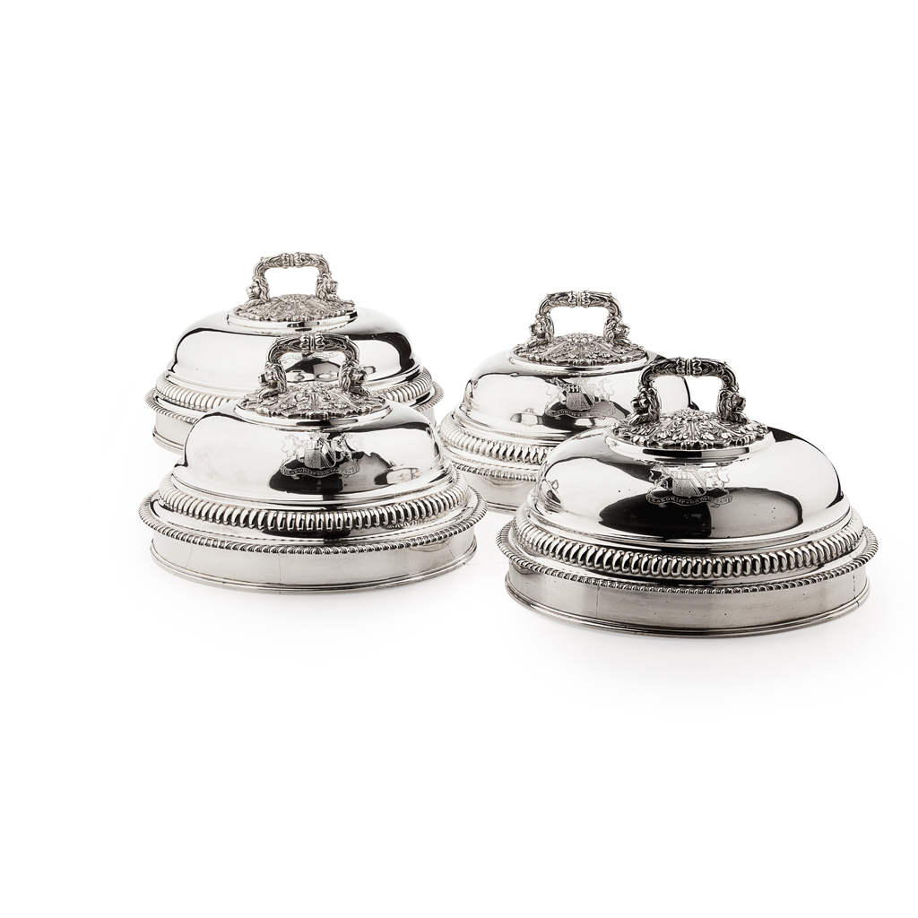 Samuel Hennell and John Terry, London 1813, of circular form, removable acanthus cast handles, chased bands of lobes and engraved armorials (4)