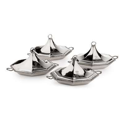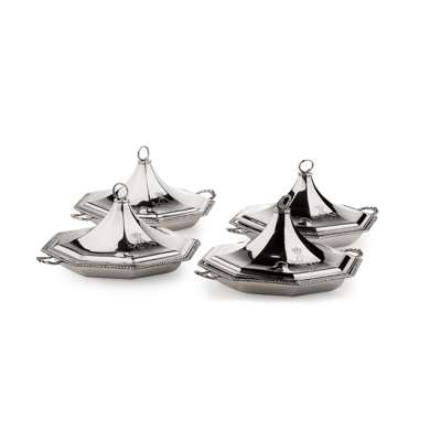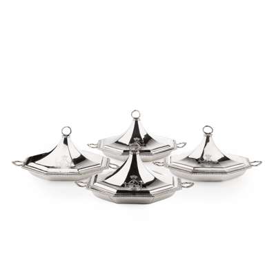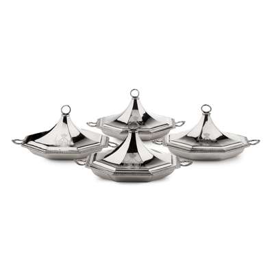 Thomas Heming, London 1773, the squat octagonal bases with scroll handles, tented covers with engraved armorials (covers unmarked) (4)