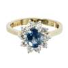 claw set with an oval cut sapphire, in a border of round brilliant cut diamonds, to a plain 18ct gold shank