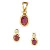 rub over set with an oval mixed cut ruby between two round brilliant cut diamonds to a plain tapering shank, stamped '18k'; together with a rub over set oval mixed cut ruby pendant and a pair of rub over set ruby and diamond earrings (3)