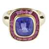 collet set with a cushion cut Tanzanite in a border of channel set step-cut rubies, to a plain yellow metal shank, stamped 18K