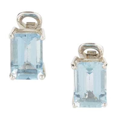 claw set with an emerald cut aquamarine, flanked by three round brilliant diamonds, to a tapering openwork shank, stamped 'plat' inside shank; together with a pair of emerald cut aquamarine ear clips (2)