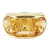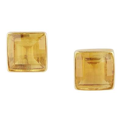 channel set with a square step-cut citrine and two hemispherical fancy cut citrines, to a bold unmarked yellow metal mount; together with a pair of fancy square cut citrine set studs, to post and butterfly fittings, stamped 750 (2)