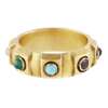 unmarked, the broad band with textured ground and raised cubes with individual set gem stones including; amethyst, turquoise, moonstone, malachite, emerald, and others