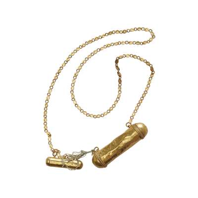 apparently unmarked, two plain cylindrical amulet cases with pull off domed covers, each with scroll in Hebrew, probably Iraq, late 19th early 20th century, with long chain of lozenge form, pierced detail (2)