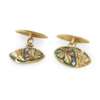 each principal terminal with cast foliate detail and green enamel ground, small old round cut diamond detail, belcher links, secondary terminal with scrolling detail, stamped 18