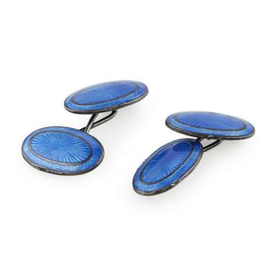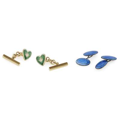 the principal terminal modelled as a heart, claw set with a central cushion cut diamond in a border of white and green enamel detail, belcher link chains to an oblong secondary terminal; together with a pair of blue enamelled cufflinks, stamped SILVER (2)