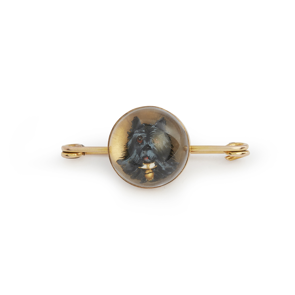 collet set with an circular essex crystal cabochon depicting a small black terrier, to a plain bar brooch stamped 15ct