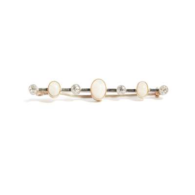 collet set with three oval opal cabochons, alternating with four old round cut diamonds, to a plain bar brooch, unmarked