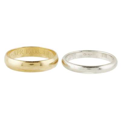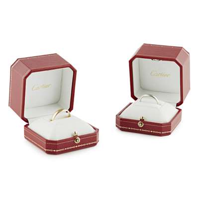 with engraved inscription TJA APR13.08.2010, signed ‘Cartier’, numbered IH 3711, stamped 750 with full French control marks; together with a platinum wedding band, signed ‘Cartier’, numbered BT0057, with full French control marks, both in tooled red leather boxes for Cartier (2)