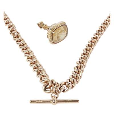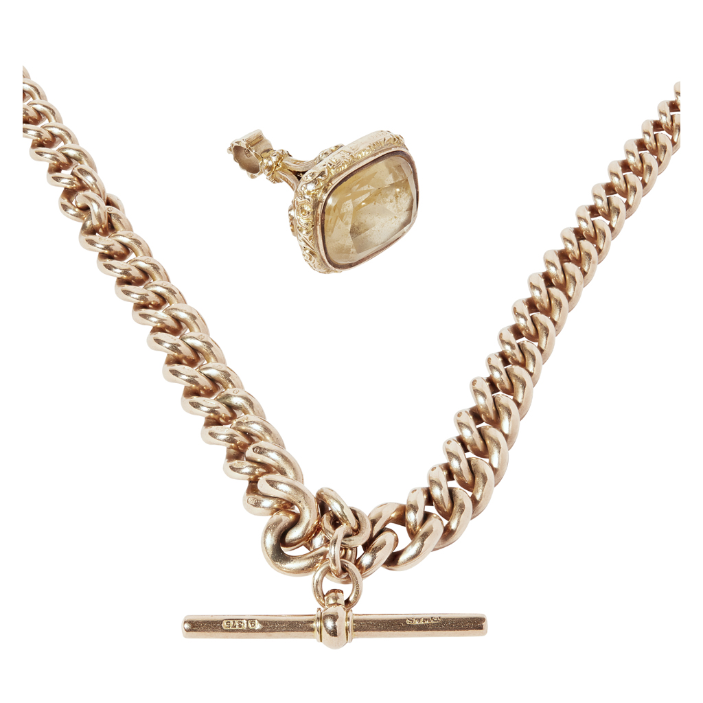 composed of graduated curb links, with T-bar pendant and associated citrine set fob