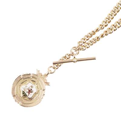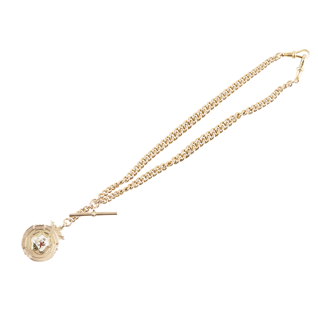 composed of curb links, suspending a T-bar and a 9ct medallion with enamel set crest to one side and presentation engraving to the other for R.V.F.C
