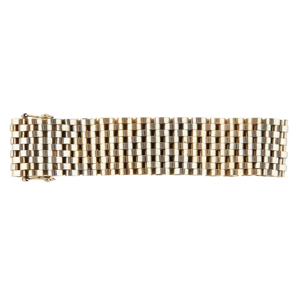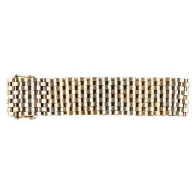 composed of alternating yellow and white brick links in a chevron pattern, clasp stamped 9ct