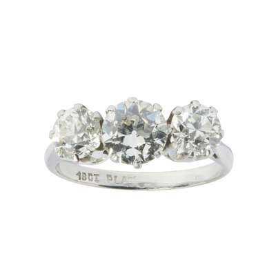 claw set with three graduated old round cut diamonds, to a plain shank stamped 18ct PLAT