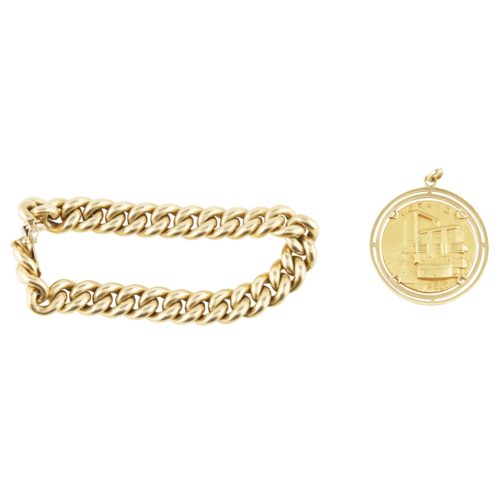 with concealed clasp and safety clip, stamped 750; together with a circular medallion for Morando, stamped 750 (2)