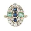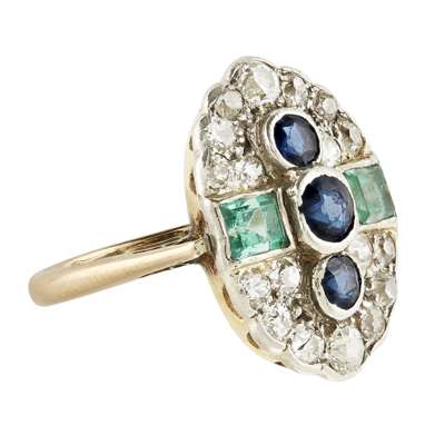 of oval form, collet set with three round cut sapphires, flanked to either side with two square cut emeralds, pavé set throughout with old round and eight-cut diamonds, to a plain yellow metal shank stamped 18CT PLAT