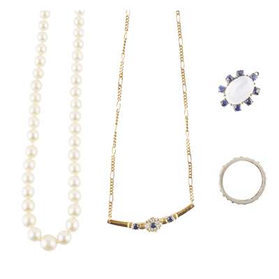 to include a graduated cultured pearl necklace, a sapphire and diamond set cluster necklace with integral chain stamped 750; together with a moonstone and sapphire pendant and a diamond set eternity ring (4)