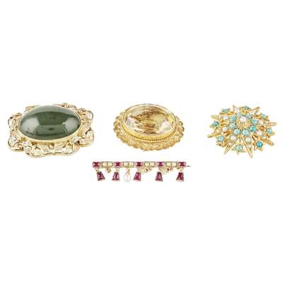 to include a 9ct gold turquoise and pearl set star brooch; a green hardstone set brooch in a pierced foliate border, unmarked; a citrine set brooch, stamped 15ct; a ruby and pearl set bar brooch with fringed detail, unmarked (4)