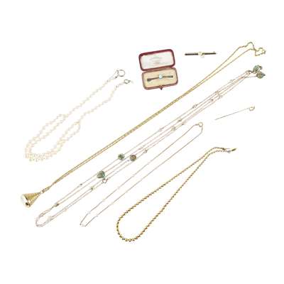 to include a pearl set neck chain, a long pearl and turquoise set neck chain; a seed pearl set tie pin, a cultured pearl necklace, a pearl set bar brooch; a pendant, a yellow metal beaded necklace and a turquoise set bar brooch (8)