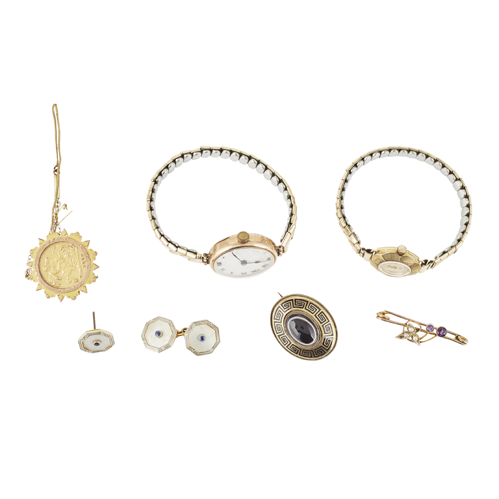 to include a Victorian banded agate and enamel set brooch, an 1897 half sovereign in a detachable bi-coloured brooch mount, stamped 9ct; an amethyst and pearl set bar brooch, an unmarked trace link chain; a single sapphire set cufflink and single matching earring, stamped 18CT &Pt; two lady's wrist watches (8)