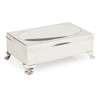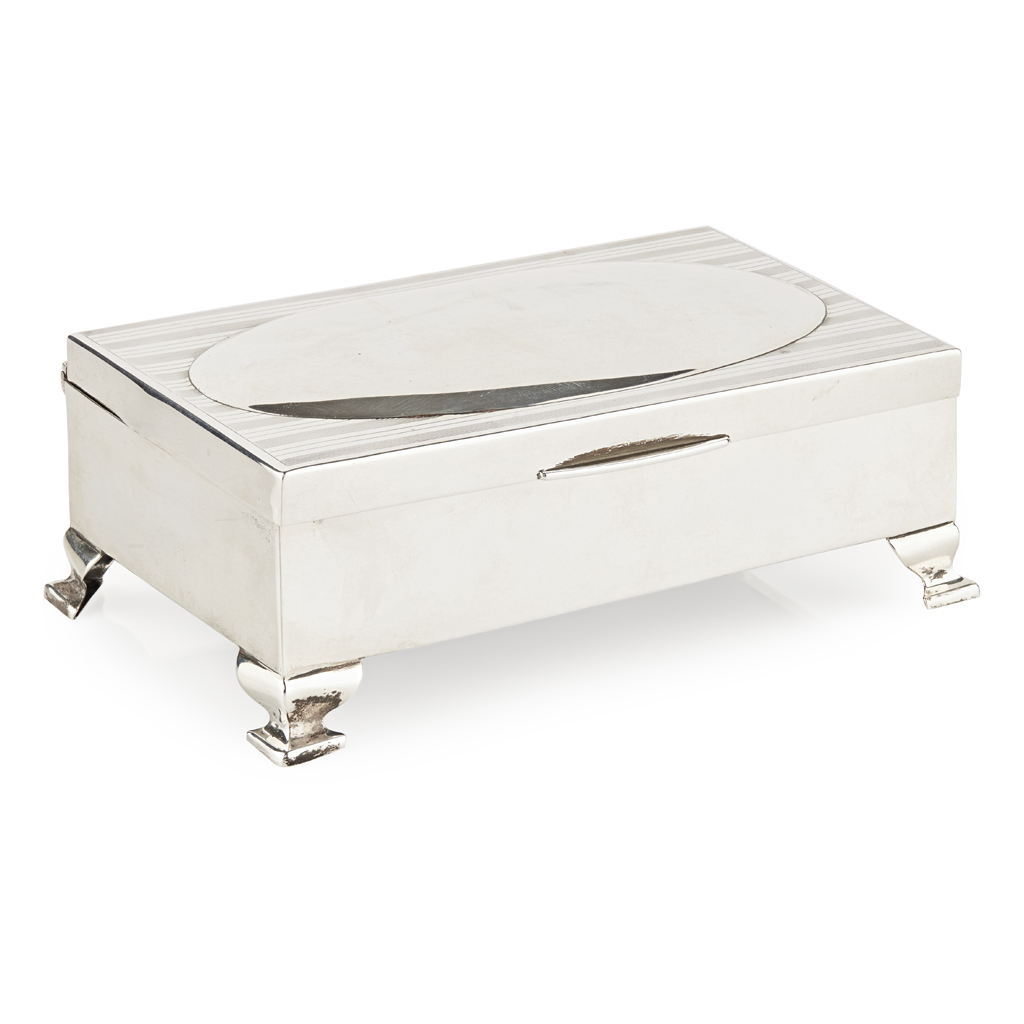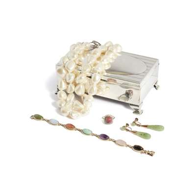 A J Zimmermann, Birmingham 1913, of rectangular form, engine turned and domed lid, fitted interior for rings all raised on ogee bracket feet; to include a cabochon gem set bracelet, a double strand of large baroque pearls, a pair of nephrite pendant earrings, a rhodonite ring (qty)