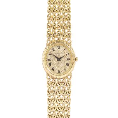 circa 1970s, the oval dial with fern effect black Roman numerals, integral woven mesh link bracelet, fold over clasp
