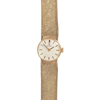 circa 1973, the small round dial with baton indicators, integral mesh link bracelet, with fold over clasp, in case and booklet