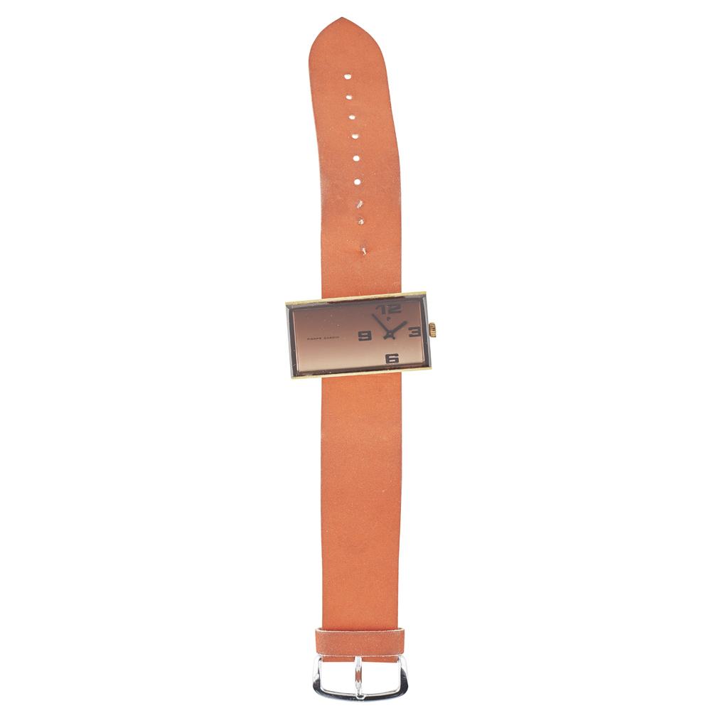 the smoky glass sloped and with offset Arabic numerals in black to the right, inscribed Pierre Cardin to the left, manual movement, orange suede effect broad strap
