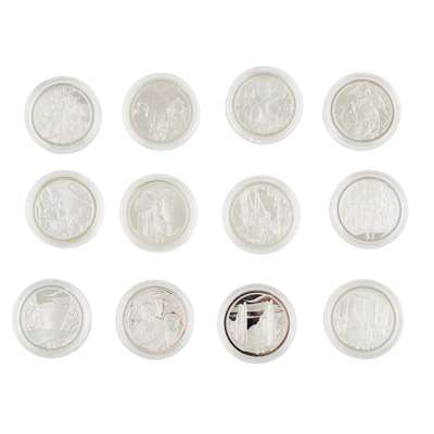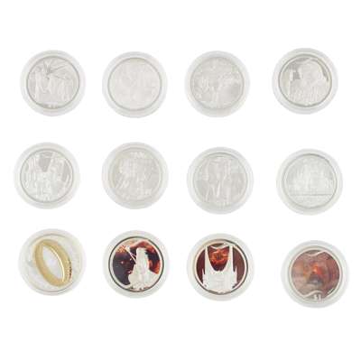 a cased set of twenty-four silver proof coins each depicting a scene from the Trilogy, some coloured, with large booklet and small folder with cards, each $1 denomination