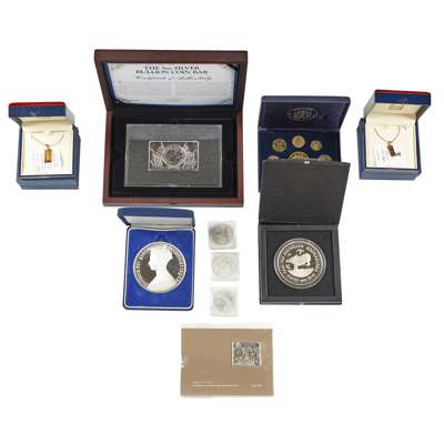 to include; proposed Scottish 2014 coin set; silver £1 stamp George V; over size proof Gothic crown; Australian 10oz Kookaburra coin; two small gold ingot necklaces; 5oz bullion coin bar; three modern silver crowns and two Churchill silver crowns (qty)